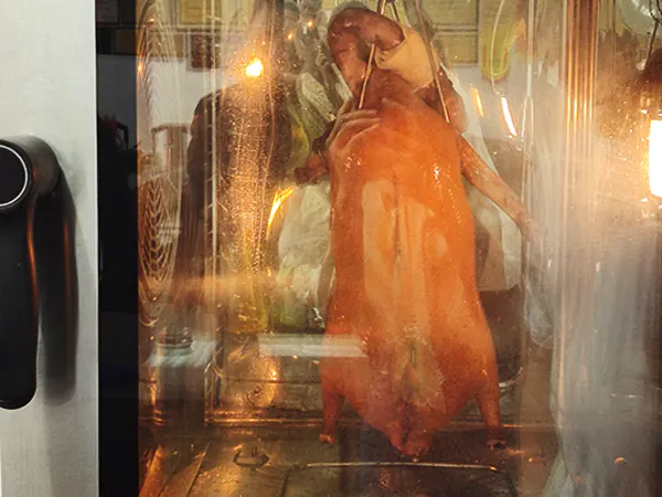 Meanwhile, the 3D hot-air circulation system surrounds the duck from the outside, creating a rich mahogany color and a crispy, non-greasy skin.