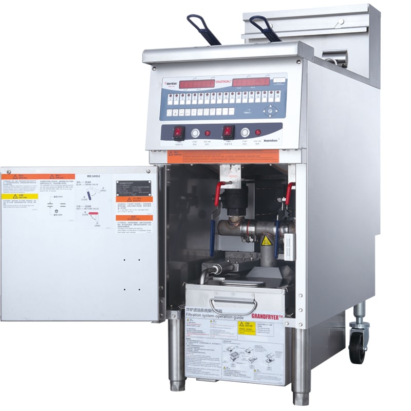 You can use the computer panel equipped with the commercial deep fryer with oil filtration to precisely adjust the temperature and timing.