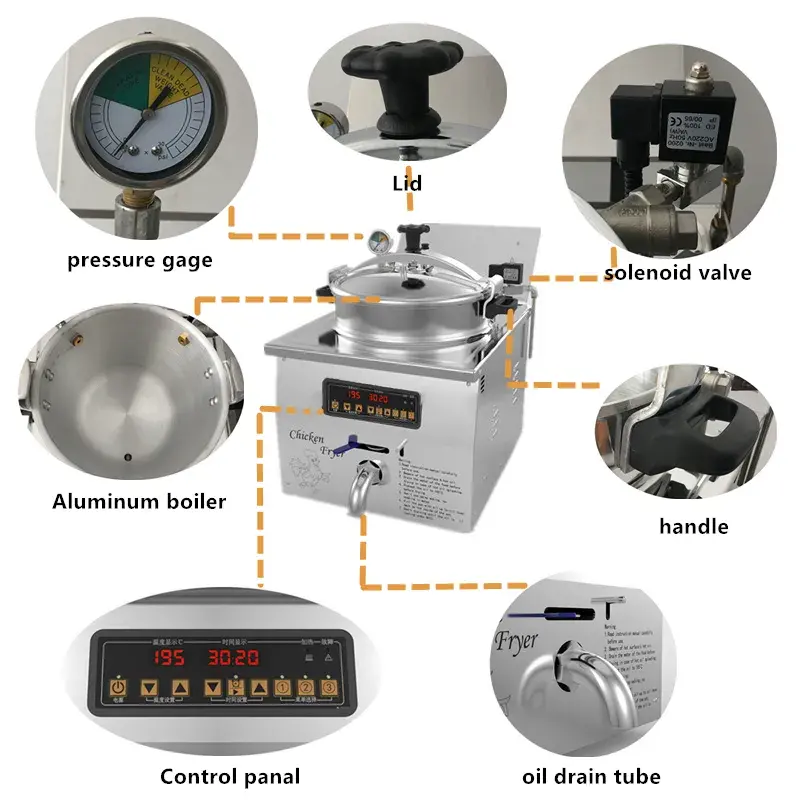 Safety and convenience are top priorities in this design. The over-temperature protection switch is a key safety feature that prevents the fryer from overheating and ensures a safe cooking environment. Its compact countertop design is perfect for kitchens with limited space, providing a powerful frying solution without compromising performance or quality. Whether you want to fry a whole chicken or a variety of other delicious foods, this KFC pressure fryer broaster is the ultimate choice for efficiency, convenience, and superior frying performance.