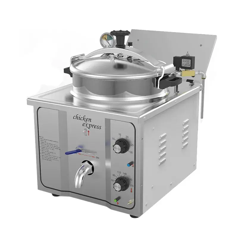 This countertop chicken pressure fryer is a state-of-the-art kitchen appliance that is crafted to deliver exceptional frying results, especially for whole chickens. Its innovative design ensures that each chicken is crispy on the outside and tender on the inside, making it a favorite among chefs and food lovers. However, it is versatile enough to handle a wide range of fried foods, making it a great choice for fast food restaurants, coffee shops, or other places where pressure fryer is required.