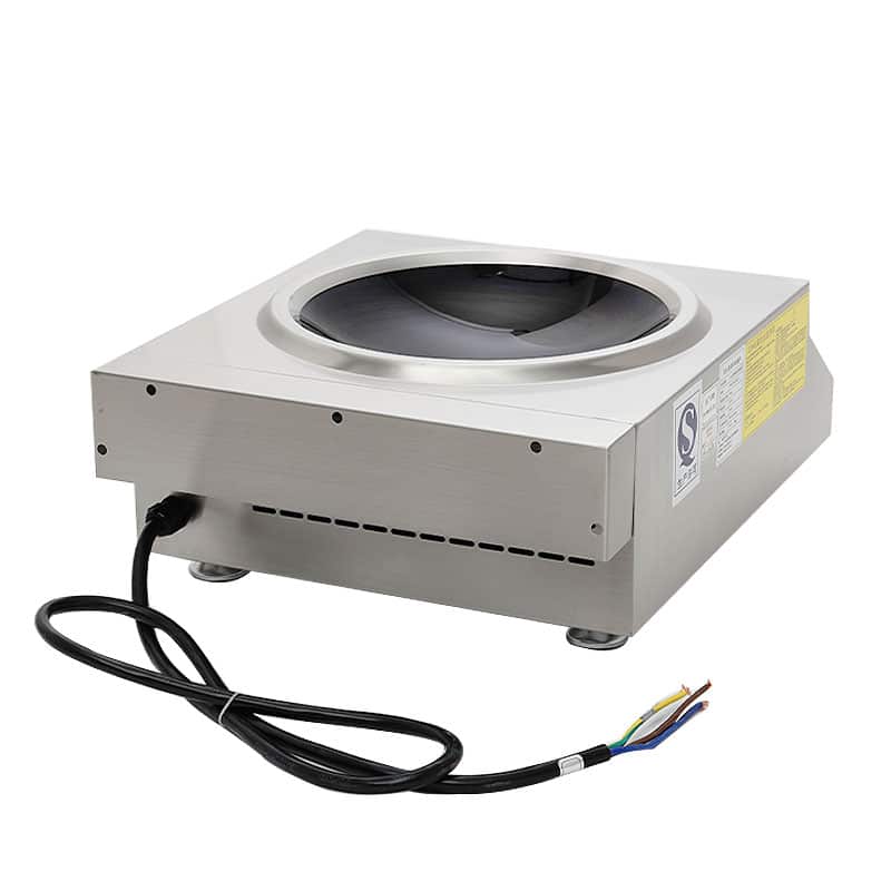 Le panneau chauffant de ce cuisinière à induction wok is concave, which has more contact area with the pot and heats up more quickly. The one-time stamped stainless steel housing has no welded spots or seams to prevent soups and water from getting inside and causing malfunctions.