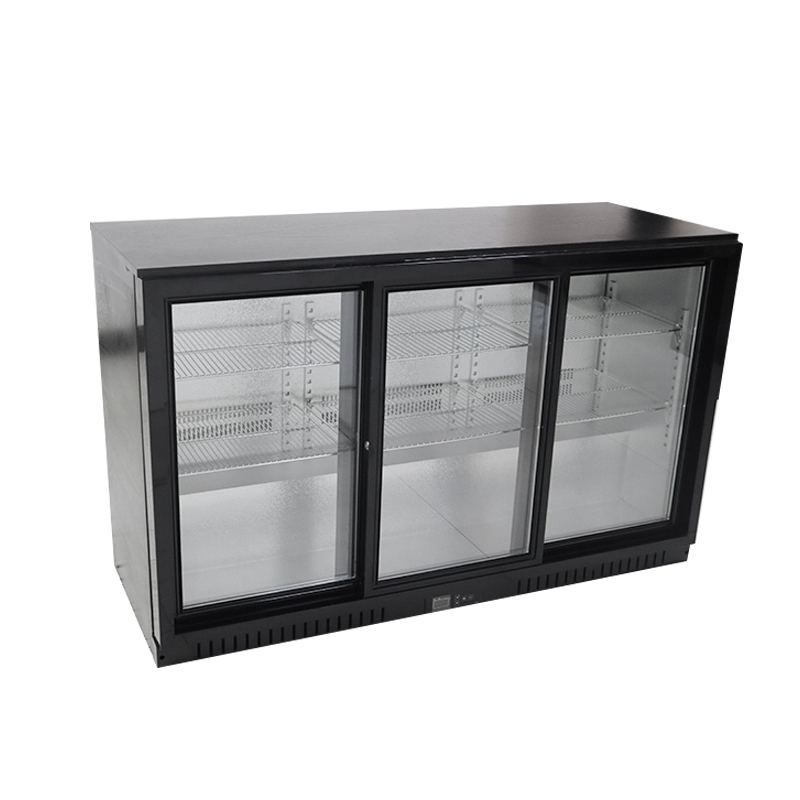 Ini kulkas pendingin bir dirancang dengan pintu geser tanpa harus menyediakan ruang untuk membuka pintu, menghemat ruang bar dan sangat cocok untuk mendinginkan bir, minuman, minuman keras dan jus lezat Anda.Ini menggunakan lemari es yang ramah lingkungan untuk menjaga suhu internal pada 0-10°C dan lebih kecil kemungkinannya untuk membeku. Pencahayaan LED dan 3 pintu kaca memungkinkan Anda untuk melihat dengan jelas lokasi item di dalam tanpa membuka pintu, mengurangi kehilangan udara dingin. Rangka baja tahan karat hitamnya yang indah dapat beradaptasi dengan semua jenis bar, restoran, dan klub dalam gaya .