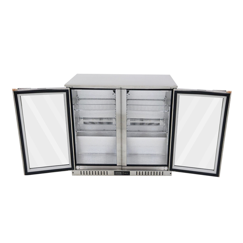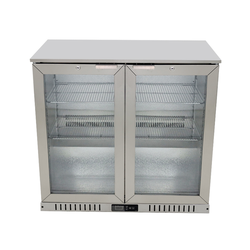 Sejak 2 pintu buai penyejuk bir hanya 835mm tinggi, bahagian atasnya yang rata dan kukuh boleh digunakan sebagai meja kerja untuk meningkatkan penggunaan ruang, di samping itu, rak keluli tahan karat boleh dilaraskan tanpa sekatan ketinggian botol.