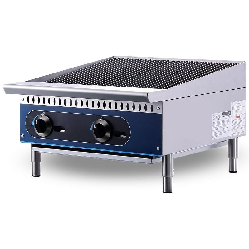 The charbroilers with 2 independently controlled burners allow you to cook different dishes at the same time on a large cooking surface. This 24 inch commercial broiler grill is built to last, bringing versatility and convenience to your kitchen. Plus, its countertop is sized to fit almost any operation, maximizing space to help increase production.