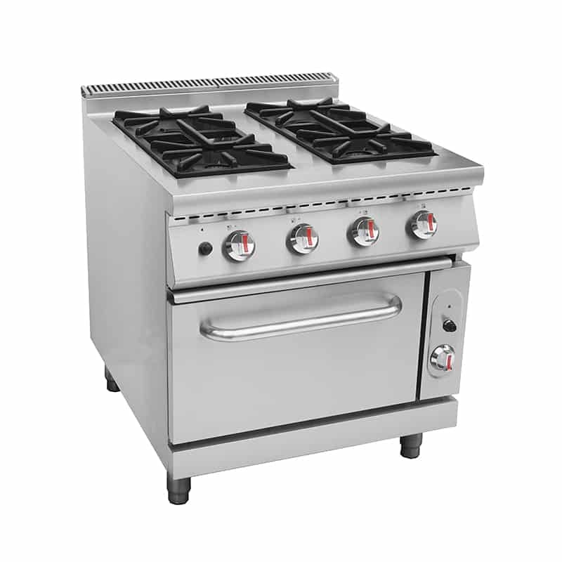 This 4 burner commercial range is equipped with two large and two small burners with a total power of 18kw and two small burners with a total power of 15kw, which have a high fire power and support you to cook four different kinds of food at the same time. Each burner is independently controlled and the knobs are made of metal, which is durable and not easy to wear. The bottom is equipped with an independently controlled oven, you can bake some other ingredients at the same time, saving you a lot of time. The oven is equipped with a high-power U-shaped burner tube for a more even temperature. The sheet metal stretching staggered seal ensures a good seal, and you can adjust the temperature between 120°C and 290°C. In addition, the heavy-duty stainless steel adjustable feet have excellent weight-bearing capacity to ensure you run smoothly during operation.