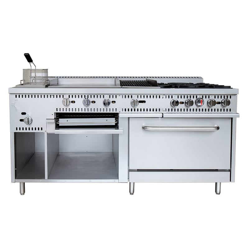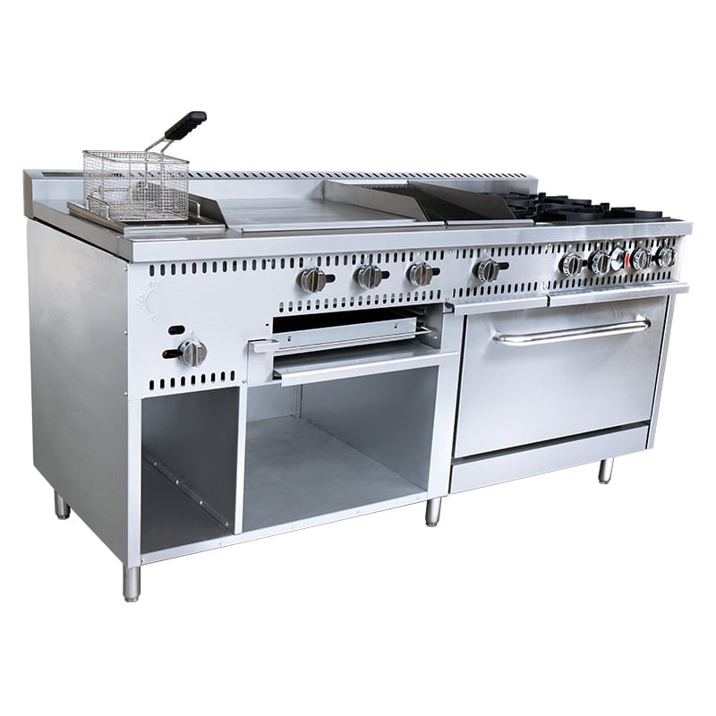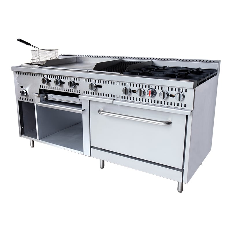 This 6 burner stove commercial supports multiple cooking styles of steaming, boiling, frying, and baking for superior versatility. The body is made of stainless steel for durability and smooth operation even in harsh commercial environments. Each zone has independent control knobs to meet your cooking requirements for different foods, and the bottom is equipped with a two-level oven so you can make some other foods and save your time. Also the bottom of the commercial fryer and commercial grill can hold some other ingredients, a perfect choice for a compact and diverse restaurant!