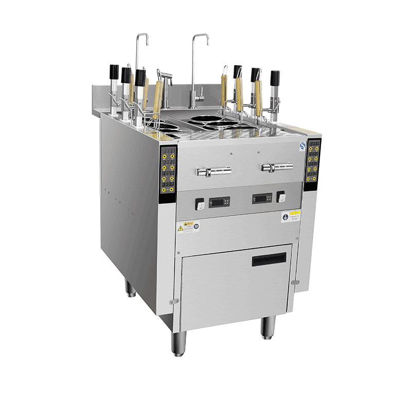 Electricity and gas multiple modes are selected to facilitate the working requirements in different environments. The Chefmax 6 head automatic gas noodle boiler can be individually timed for each basket, basket bearing high weight can be timed and fixed temperature.