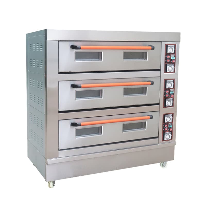 This commercial kitchen ovens with 3 deck has double tempered glass and double fixed clips to maintain the temperature and humidity inside the box and also guarantee the safety of the operator. High precision of temperature control by the knob. probe and oven surface, oven bottom temperature double control, so that the oven maintains the appropriate temperature you can freely choose high or low temperature according to your cooking needs. The machine is equipped with a steam replenishment function, so you don’t have to worry about the box being too dry.