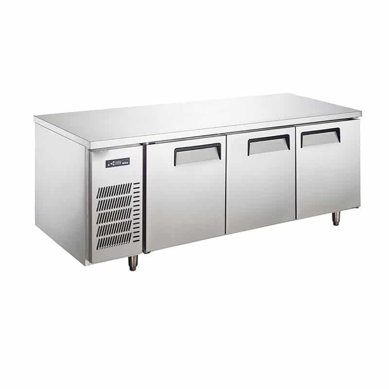 This best under counter refrigerators features a 3-door with shelf design for easy storage 350-watt compressor provides powerful power to ensure the unit works consistently and consistently. The flat and smooth countertop makes it a reliable workstation without taking up other space. The air cooling mode allows for more even cooling without frosting, improving the quality of food preservation. Its digital control panel and convenient casters make the 3 door undercounter refrigerator easy to use.