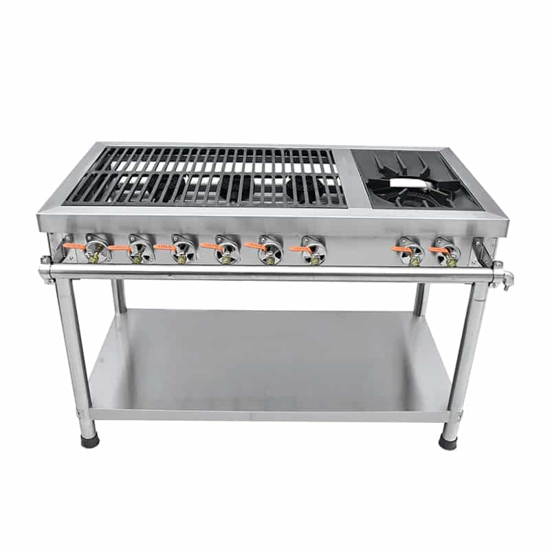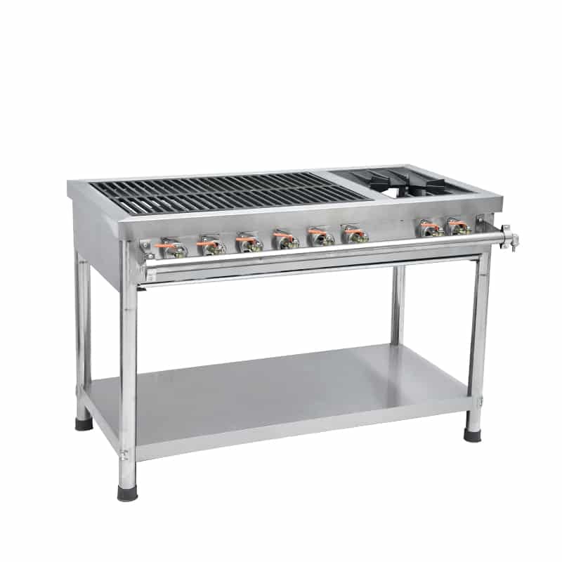 In addition, there is a storage shelf and a removable grease tray underneath the commercial kitchen ranges. The grease tray collects excess grease and water from the cooking process, making it easy to dump and clean, while the storage shelf can hold various items, making it easier to access and improving cooking efficiency.