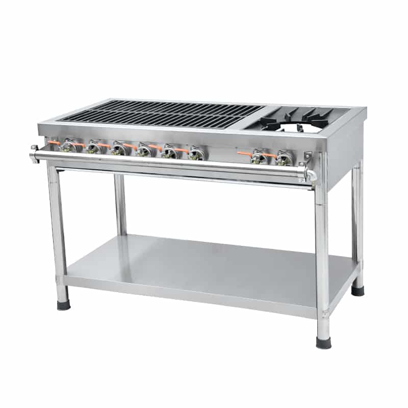 In addition, there is a storage shelf and a removable grease tray underneath the commercial kitchen ranges. The grease tray collects excess grease and water from the cooking process, making it easy to dump and clean, while the storage shelf can hold various items, making it easier to access and improving cooking efficiency.
