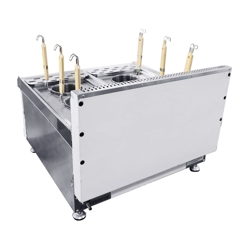 The commercial automatic noodle cooker is equipped with six cooking baskets with insulated basket handles to protect the operator. They are housed in two removable water tanks, each with its own heating control knob for cooking at different temperatures or using one side separately. A draining board with holes in the front supports quick water filtration.