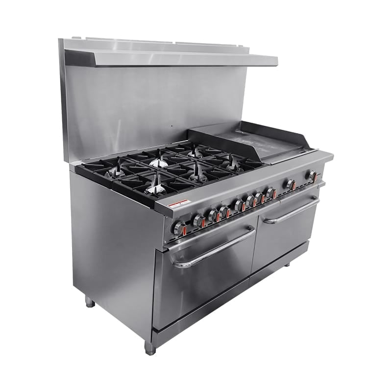 With 6 open burners, 2 ovens with shelves and a griddle, this high output commercial double oven gas range is capable of handling most cooking tasks in the kitchen.