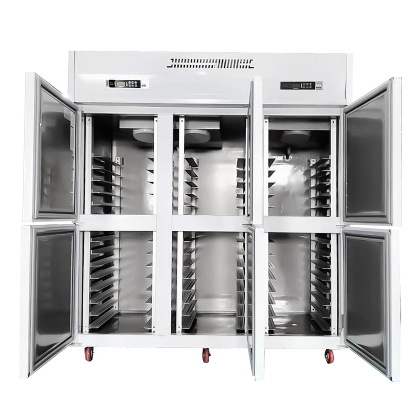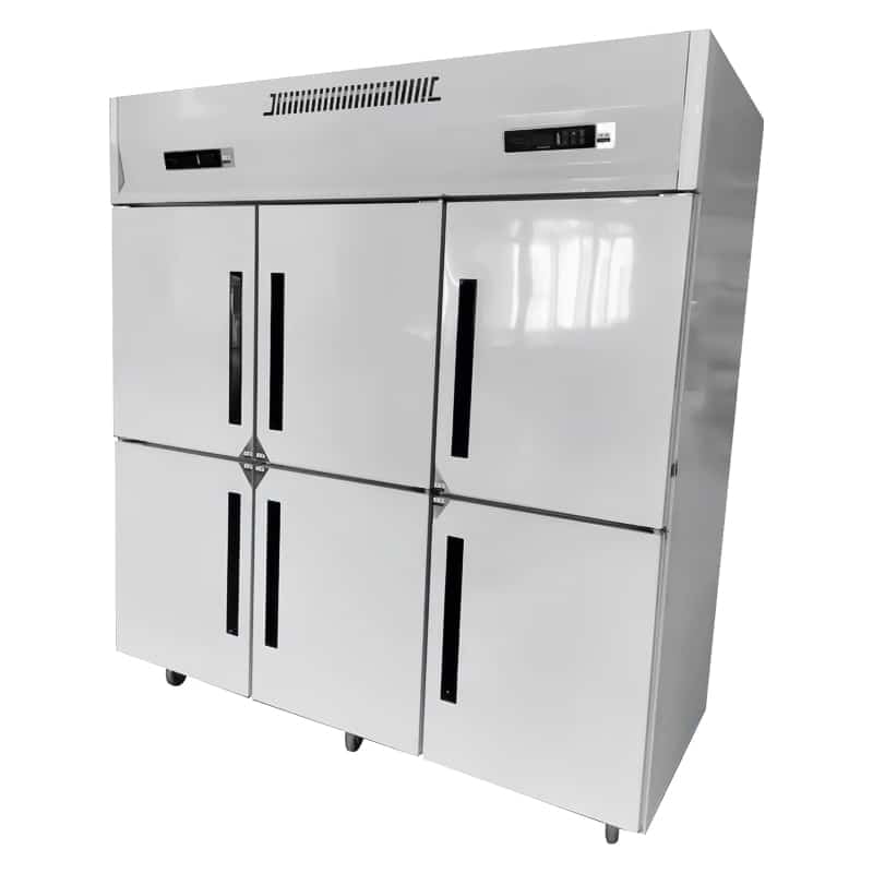 This commercial refrigerator is made of thickened stainless steel for durability and a classic look. The stand refrigerator features an air-cooled refrigeration mode that is less prone to frost and provides balanced cooling to improve the quality of food preservation.Combining both refrigerated and frozen modes, with four of the six door spaces used for refrigeration and the other two for freezing, this commercial dual temp refrigerator freezer is a durable, reliable and easy to use freezer that is essential if you want your fresh vegetables and meats to be properly preserved.