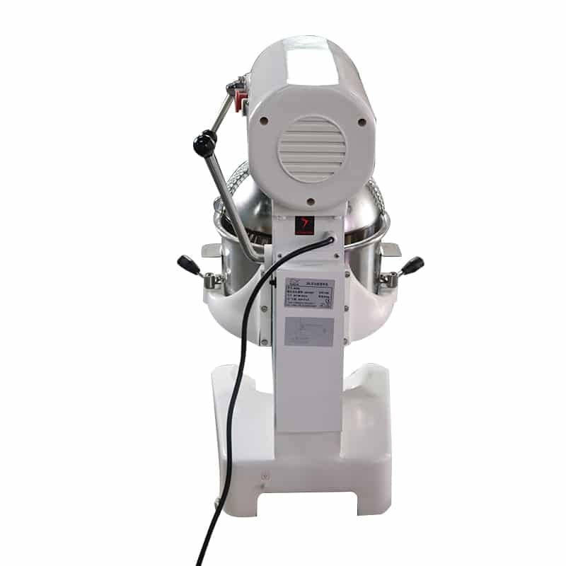 This commercial floor stand mixer is equipped with a guard and an emergency stop switch, which automatically cuts off the power when the guard is lifted upwards to protect the operator’s safety.