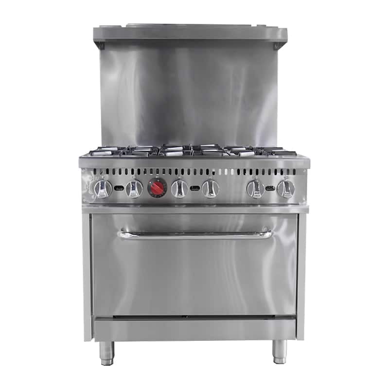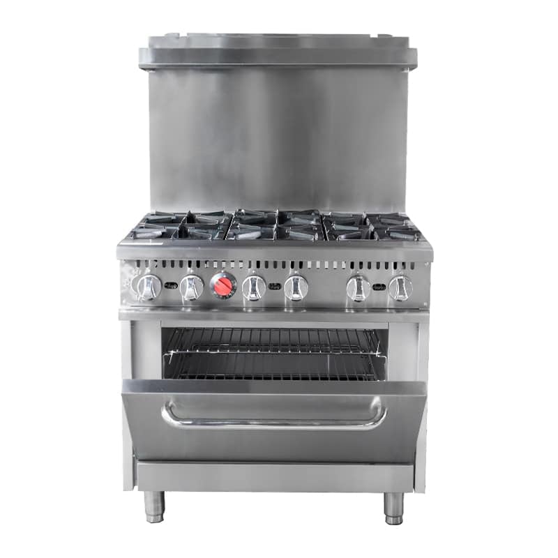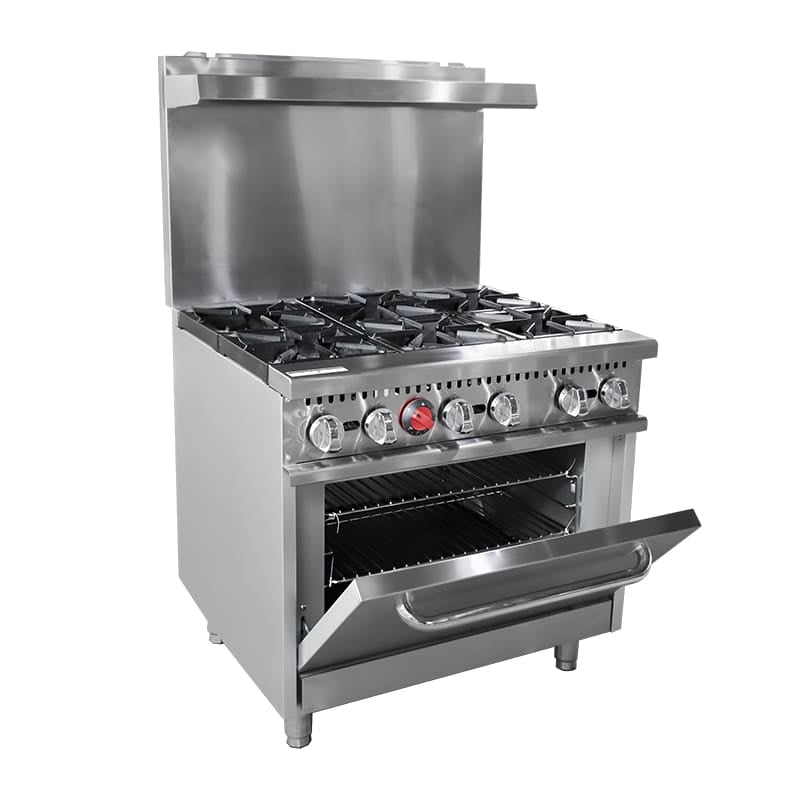 Delivering 210,000 BTU of power, this commercial gas kitchen equipment has six open burners and one oven with shelves for great kitchen space savings, and an oven thermostat that can be freely adjusted from 250°F-550°F.