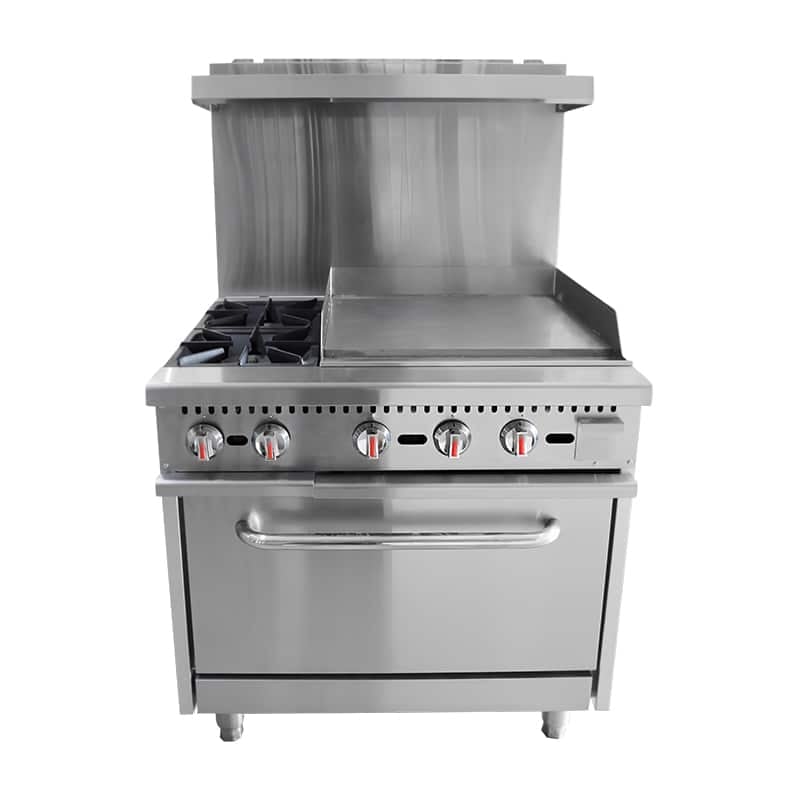 With 2 open burners, 2 high-side griddle and 1 spacious ovens, this commercial gas range with griddle meets most cooking needs for cooking, cutting, baking and frying with increased efficiency. The sturdy stainless steel main construction and thicker grill pan and cast iron grates are durable enough to work longer in commercial kitchens. Heating is very fast, with individual metal knob controls for each burner. Stainless steel support feet allow the two-head cooker with oven to rest securely on the floor while in use.