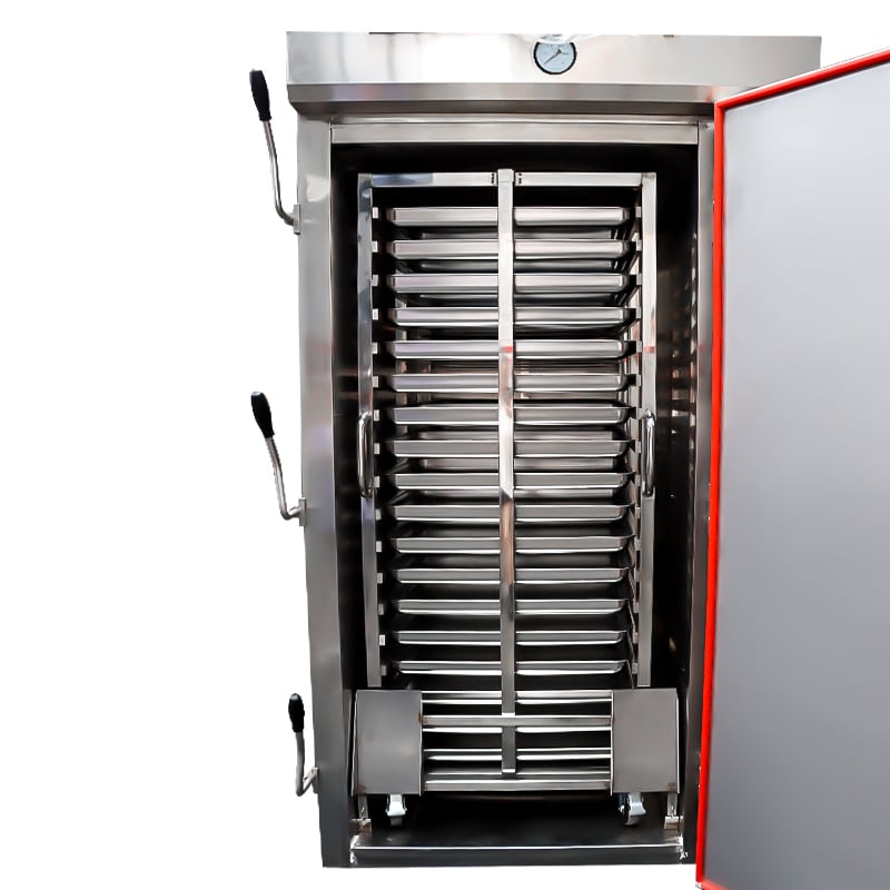 This single door electric steamer is made of high quality stainless steel, durable and stylish, smooth and easy to clean. The computer panel control system, you can adjust the appropriate temperature, and also has reservation and timing functions, which provides great convenience for your food preparation. With the design of push trolley, you can directly push out the cooked meals directly after the machine finishes its work and proceed directly to the next work, which greatly improves the efficiency of the kitchen. It has induction ball valve and water shortage induction probe, when the equipment is short of water, the alarm system will start, the machine will start to add water automatically, the water is full automatically stop, very good to avoid dry burning, thus extending the life of the machine.