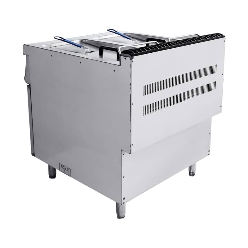 The commercial vertical gas deep fryer has two tanks and two baskets, each with a separate heating knob and drain valve, so the operator can choose to use one side alone or cook at a different temperature. The basket handles are insulated so that the baskets can be hung on the equipped racks to drain the grease after the food is done cooking.