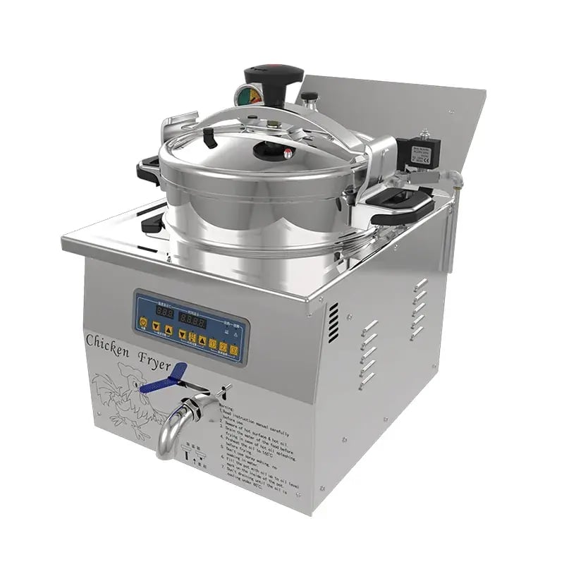 Safety and convenience are top priorities in this design. The over-temperature protection switch is a key safety feature that prevents the fryer from overheating and ensures a safe cooking environment. Its compact countertop design is perfect for kitchens with limited space, providing a powerful frying solution without compromising performance or quality. Whether you want to fry a whole chicken or a variety of other delicious foods, this KFC pressure fryer broaster is the ultimate choice for efficiency, convenience, and superior frying performance.