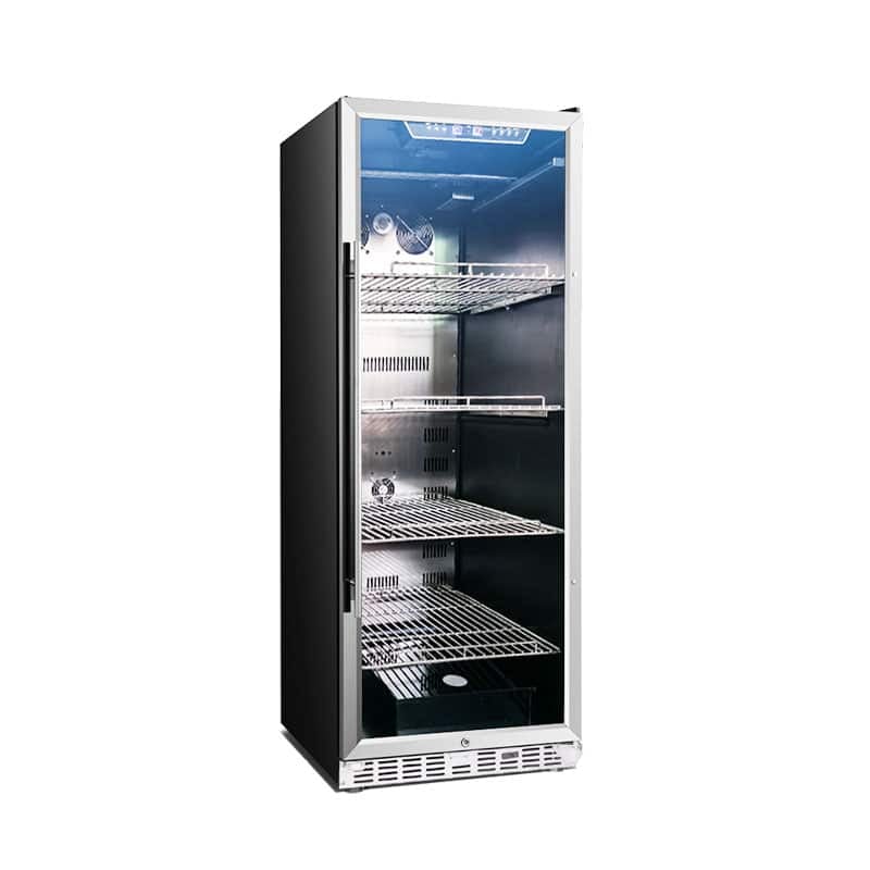 This dry aged meat refrigerator is a single-door, four-layer stainless steel shelf design that can accommodate 380L of meat. The equipment has a device for accurately controlling temperature and humidity. The machine can automatically adjust the humidity according to the state of the food, provide real-time temperature feedback, and can also adjust the temperature manually. The precise temperature control error is less than ±0.1°C, and the aging consumption is minimal (the loss is about 7 to 8% after four weeks).