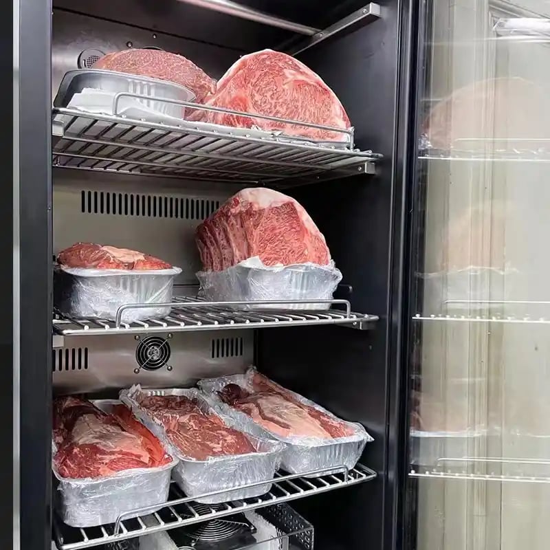It can retain up to 90% of its original weight over 30 days, greatly increasing the value of beef for steakhouses, restaurant chains, grocery stores or other dining establishments. In addition, the stainless steel shell is made of thick material, beautiful and elegant, with a defogging function, and combined with double tempered glass doors, it is not only beautiful but also easier to attract customers’ attention, achieving excellent display effects.