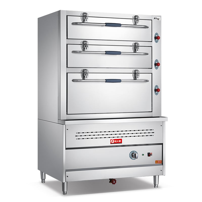 The three-door design features independent control switches for each layer, allowing you to steam different ingredients simultaneously. Its thickened stainless steel body is rust-resistant, durable, and easy to clean, making it highly efficient. After operation, the steam key enables safe opening of the doors, and the steam circulation design is both energy-saving and environmentally friendly, ensuring that steam circulates within the equipment without wasting or consuming excess energy.