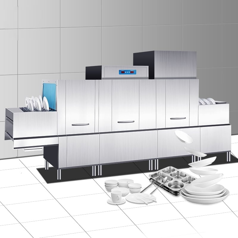 The industrial dishwasher conveyor is an all-in-one dishwasher that removes scraps, cleans, sanitizes, and dries, simple control panel, so that the staff more convenient operation!