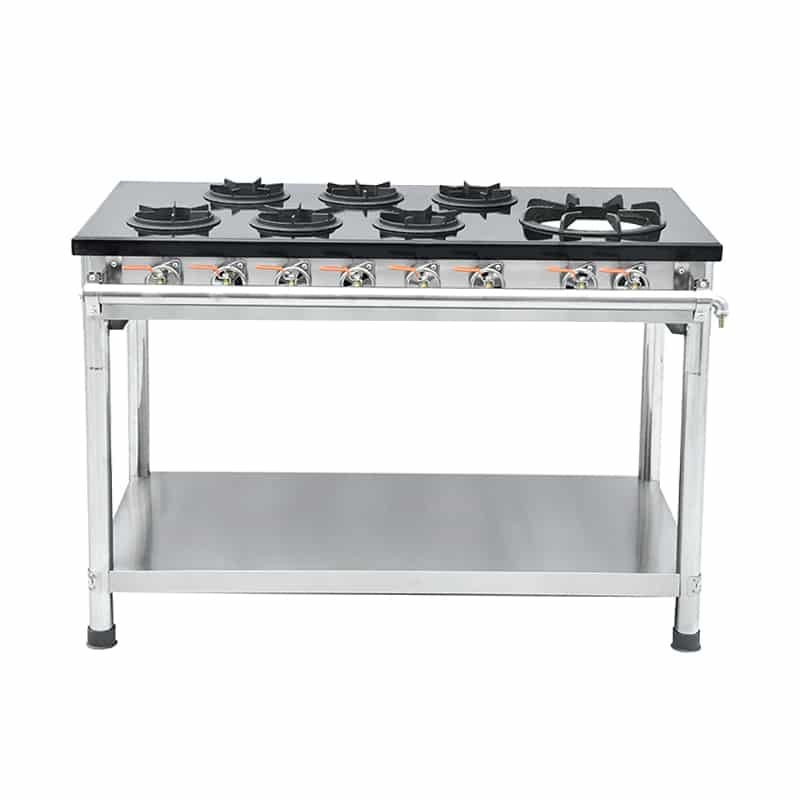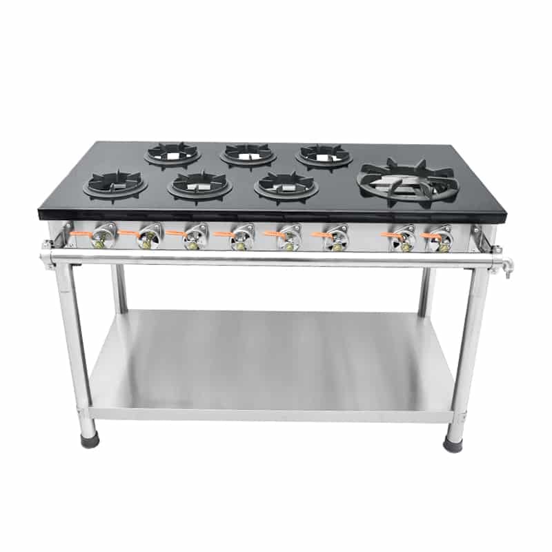 The unit is made of 201 stainless steel and cast iron grate, there are 7 burners in total, 1 big and 6 small on the iron plate, the excellent heating performance provides 17KW+42KW power, the unique energy-saving design makes its gas consumption only 1/3 of the traditional blast stove. each burner has a separate adjustment valve, the operator can freely adjust the fire or use only a few of them.