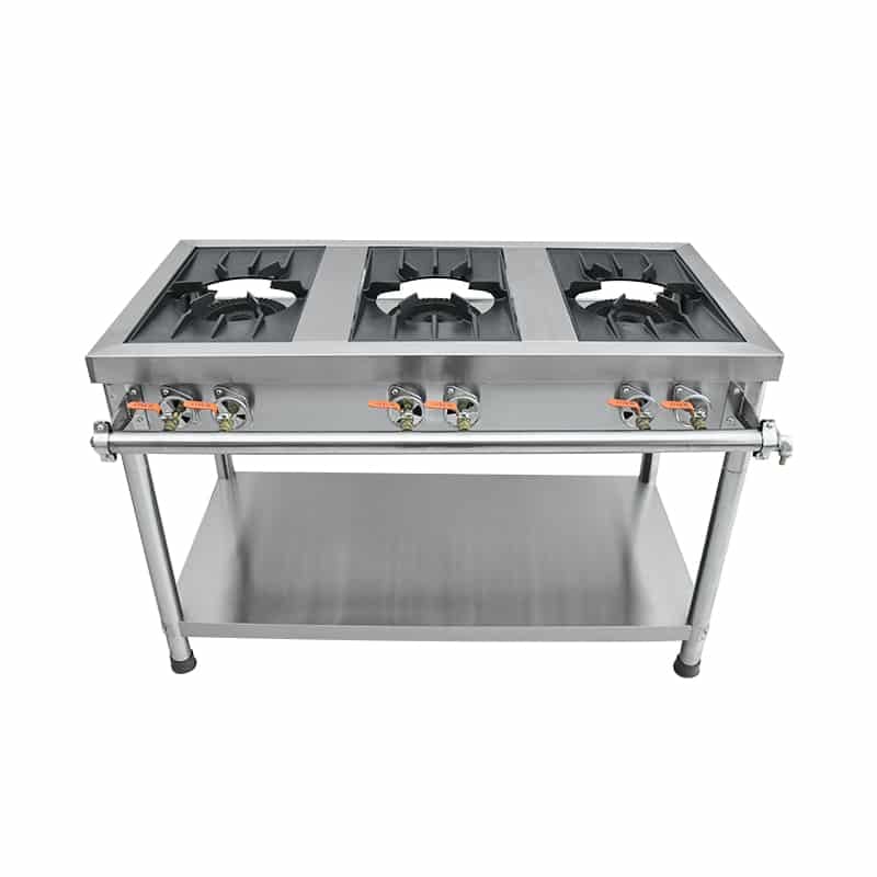 This kitchen ranges is made of 201 stainless steel and cast iron grate, with 3 double ring burners and 17KW*3 high power, shortening food ripening time, high heat frying makes dishes better flavor, the unique energy-saving design makes it consume only 1/3 of the gas of traditional blast stove. high quality gas valve and connection port can operate stably for a long time, avoiding the risk of leakage. Each burner has two adjustment valves, so the operator can freely adjust multiple levels of fire.