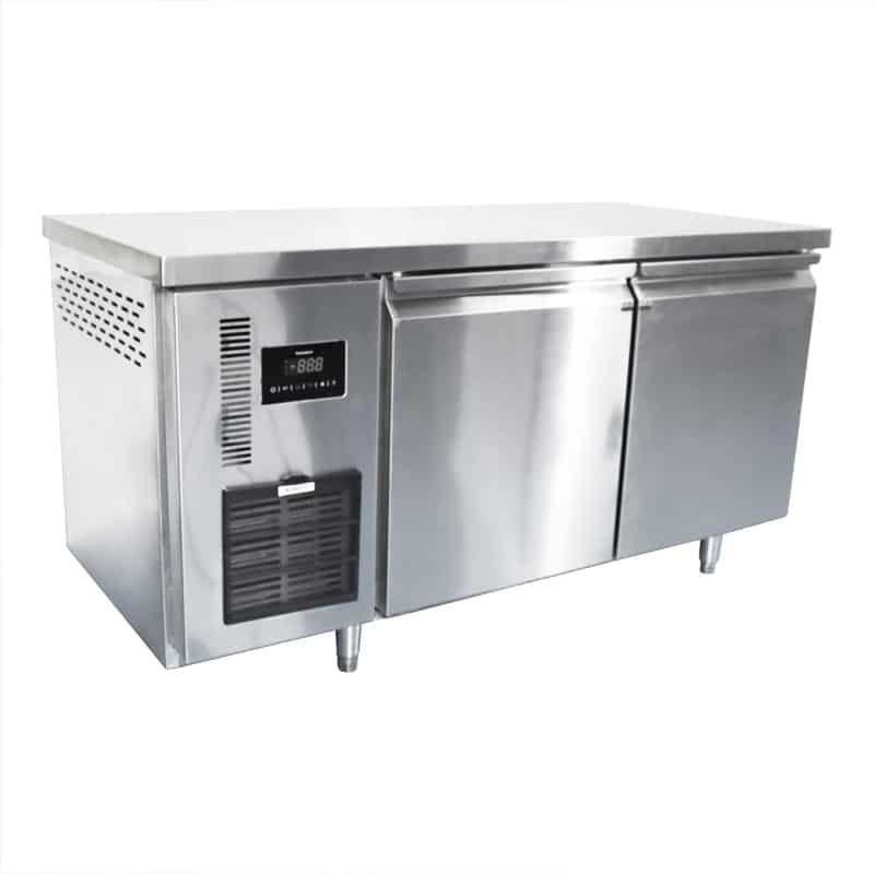 This refrigerators under counter features a high-powered compressor and thickened stainless steel construction for stable operation in hot and busy kitchen environments. The air cooling mode allows for more even cooling without frosting, improving the quality of food preservation. Two doors with shelves are designed for easy storage. The flat and smooth countertop makes it a reliable operating table without taking up other space. Its convenient casters and digital control panel make the 2 door undercounter refrigerator easy to use.
