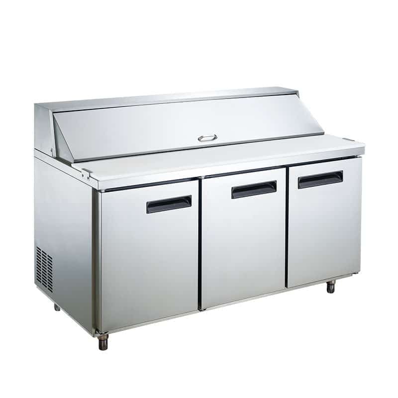This salad prep refrigerator offers you convenient features and capacity to help simplify sandwich or salad prep and increase your preparation efficiency, while it has a huge top to hold a variety of ingredients and 2 lower coolers to store spare ingredients, dressings and other cold products. Divider bars are also included for maximum convenience. Air cooling mode allows for more even cooling and improved food preservation. Thick stainless steel construction with a smooth and easy-to-clean surface makes air-cooled 3 door salad prep cooler the most economical choice for your restaurant!This salad prep refrigerator offers you convenient features and capacity to help simplify sandwich or salad prep and increase your preparation efficiency, while it has a huge top to hold a variety of ingredients and 2 lower coolers to store spare ingredients, dressings and other cold products. Divider bars are also included for maximum convenience. Air cooling mode allows for more even cooling and improved food preservation. Thick stainless steel construction with a smooth and easy-to-clean surface makes air-cooled 3 door salad prep cooler the most economical choice for your restaurant!This salad prep refrigerator offers you convenient features and capacity to help simplify sandwich or salad prep and increase your preparation efficiency, while it has a huge top to hold a variety of ingredients and 2 lower coolers to store spare ingredients, dressings and other cold products. Divider bars are also included for maximum convenience. Air cooling mode allows for more even cooling and improved food preservation. Thick stainless steel construction with a smooth and easy-to-clean surface makes air-cooled 3 door salad prep cooler the most economical choice for your restaurant!This salad prep refrigerator offers you convenient features and capacity to help simplify sandwich or salad prep and increase your preparation efficiency, while it has a huge top to hold a variety of ingredients and 2 lower coolers to store spare ingredients, dressings and other cold products. Divider bars are also included for maximum convenience. Air cooling mode allows for more even cooling and improved food preservation. Thick stainless steel construction with a smooth and easy-to-clean surface makes air-cooled 3 door salad prep cooler the most economical choice for your restaurant!