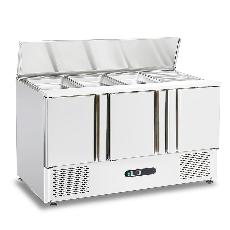 This salad sandwich prep table refrigerator has a large top to hold a variety of ingredients and a lower freezer to store spare ingredients, condiments and other refrigerated products. In addition, since the unit uses R290 refrigerant, it is a responsible and environmentally friendly choice for any business.