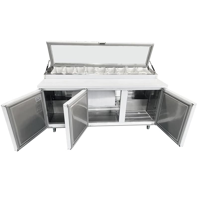 With its powerful and stable compressor and stainless steel construction, it can operate consistently in hot and busy kitchen environments. The air cooling mode allows for more even cooling and improved food preservation. Whether used in schools, pizzerias or fast food restaurants, this 3 door pizza prep fridge will make pizza making more efficient with its convenient features and capacity.