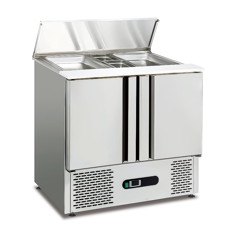 The salad refrigerator with 2GN top tray has trays for handling ingredients that are also made of high-quality stainless steel and will not rust or produce food odors. The lids of the trays are insulated to keep ingredients cool and ensure freshness. The unit’s cooling system uses a compressor to limit the freezing of food.